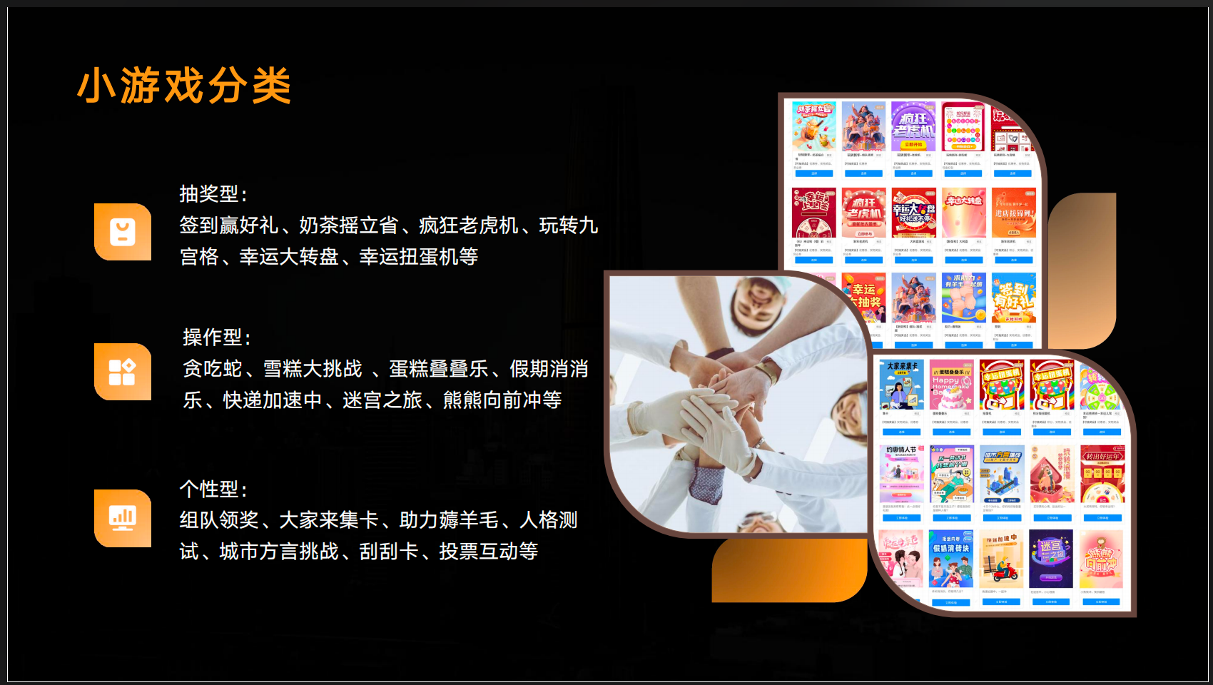 100+的纯H5小游戏库,可适配不同企业不同营销活动,特别适合企业短频快营销节奏。支持企业定制改造,无缝嵌入企业官网、小程序、公众号、app等。